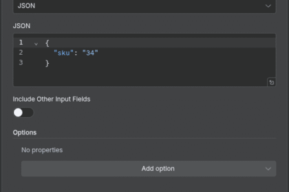 Em parameters->Mode coloque: JSON No campo “JSON” insira os dados formato JSON como padrão, nesse caso sku com valor 34: {“sku”: “34”} Deixe todos os outros campos ...